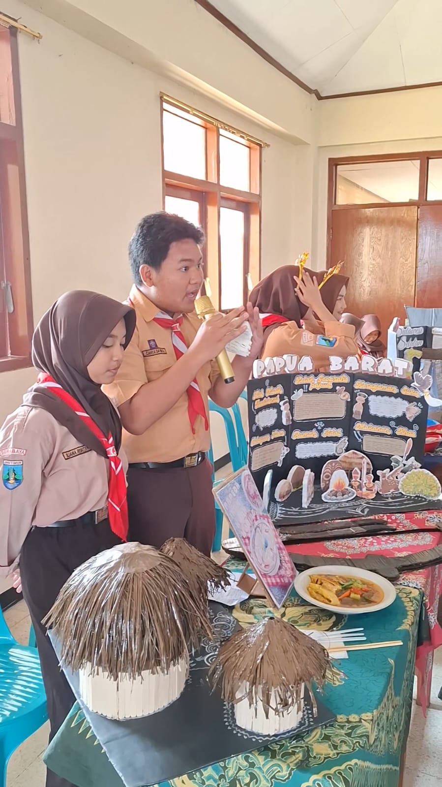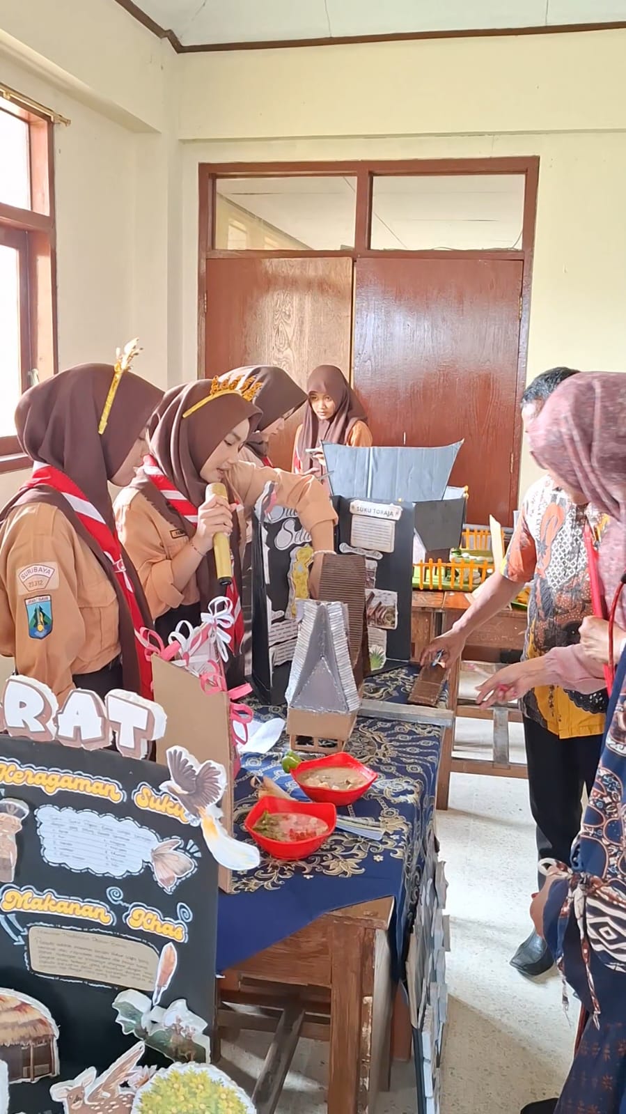 Replika Rumah Adat: Para siswa memamerkan kreativitas mereka dengan membangun miniatur rumah adat menggunakan bahan-bahan daur ulang seperti bambu, stik es krim, hingga kardus bekas. Detail arsitektur seperti Rumah Gadang, Joglo, hingga Honai terlihat berdiri megah di setiap sudut stan kelas.